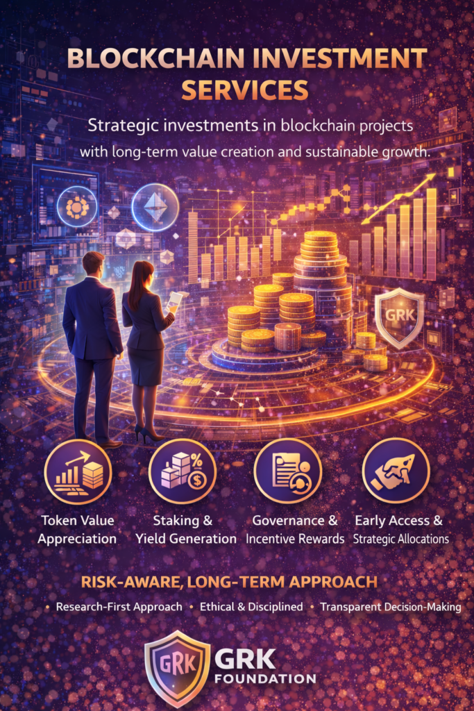 With GRK Foundation’s Blockchain Investment Services, investors gain access to a structured, research-driven, and forward-looking approach to blockchain capital deployment. Our mission is to transform blockchain opportunities into sustainable, long-term value, balancing innovation with responsibility and growth with risk management.