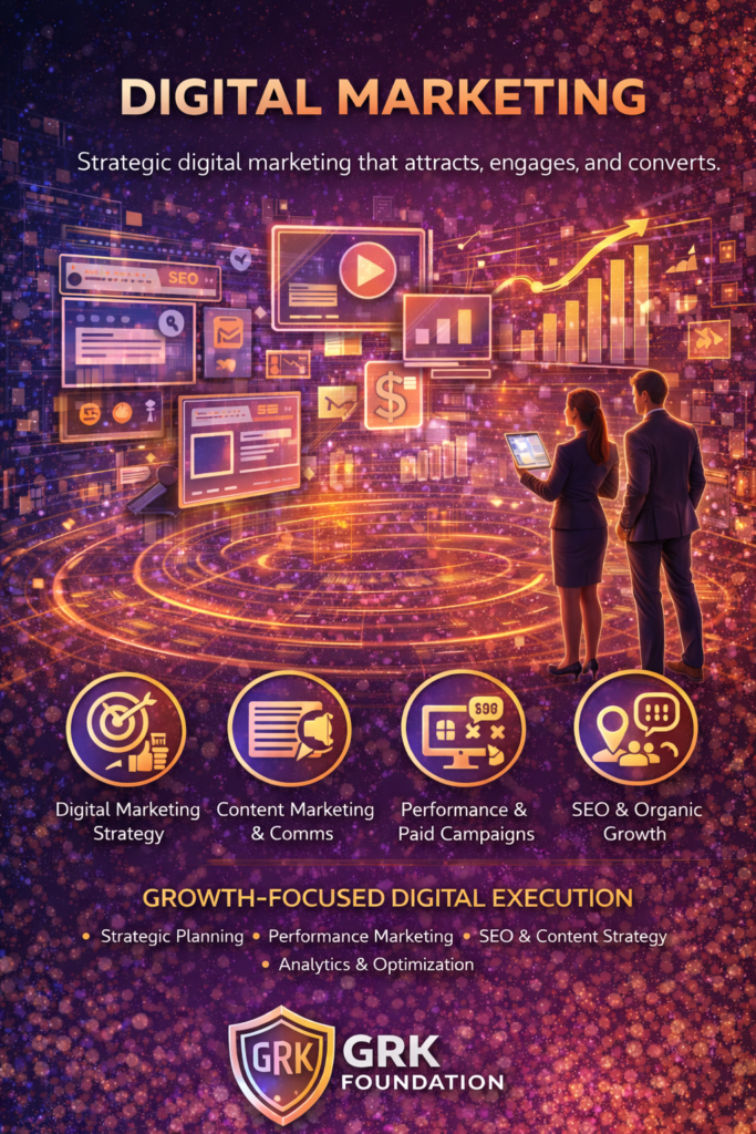 GRK Foundation’s Digital Marketing service is designed to help businesses build meaningful online visibility and convert attention into measurable outcomes. In a digital landscape crowded with noise, success depends on strategy, precision, and continuous optimization—not just ad spend or content volume.