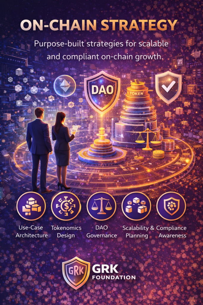 Sustainable on-chain growth requires more than deploying smart contracts—it demands strategic planning, disciplined execution, and long-term vision. GRK Foundation’s On-Chain Strategy service helps organizations design scalable, compliant, and economically sound on-chain systems that can evolve with changing markets and regulations.